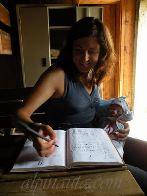 Imbocchiamo l'ampio sentiero che in leggera discesa la raggiunge ed entriamo a curiosare. Gabriele dorme beato sopra un cuscino sul tavolo mentre firmiamo il libro della casera e pranziamo, ma poco dopo è il suo turno di reclamare il pranzo!