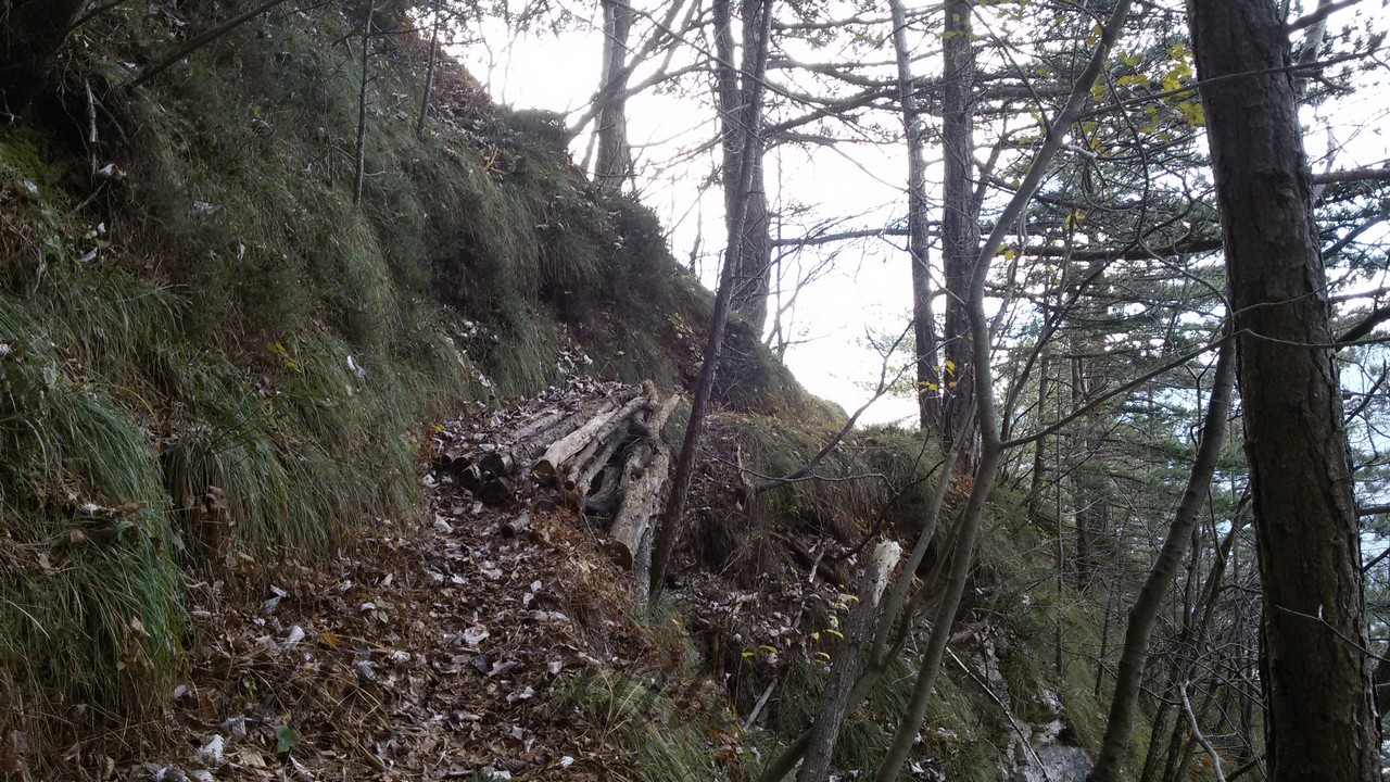 Uno sguardo al pendio boscato e il nostro piano A fallisce miseramente dopo pochi metri di cammino. Quello che sembrava essere un sentiero, dopo la canaletta di scolo dell'ultimo tornante per la Forca del Cristo, sparisce nel nulla, nel ripido bosco ricoperto di foglie. L'idea di ravanare alla cieca, seguendo la traccia che anche il fedele Oruxmaps riporta, non ci va a genio. Una seconda traccia partirebbe dal terzultimo tornante ma abbiamo tempi "strettini": un veloce controllo inconcludente pure a quello e decidiamo che non ci va di sprecare la bella giornata alla ricerca di vecchi sentieri, con il rischio di non arrivare ad una meta.