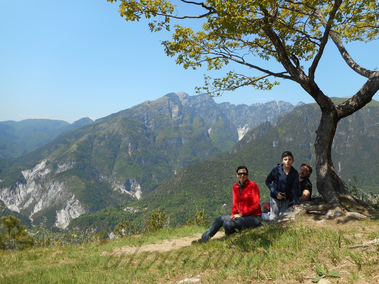 E poi, l'abbraccio protettivo degli alberi si apre e libera il nostro sguardo in un ampio e soleggiato respiro. Il carpino è lì, solitario e verde di primavera, ad accogliere il viandante stanco. Ai suoi piedi, una panca improvvisata su due tronchi, ci permette di godere della vista e di pranzare comodamente.